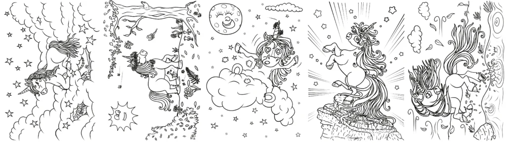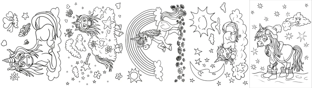 5 Beispiel-Ausmalseiten aus dem “25 Herzige Handgezeichnete Einhörner Malbuch”